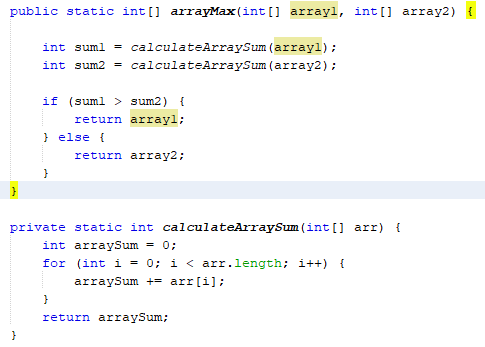 In the example below the arrayMax method returns the array with the largest sum. Here we can see that the for loops are repeated for both arrays, thus producing a duplicating code.